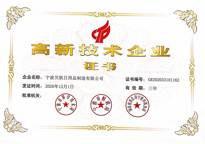 公司于近日收到由寧波市科學技術局、寧波市財政局、國家稅務總局寧波市稅務局聯合為我司旗下4家子公司:寧波國瑯機器人科技有限公司、寧波華寶百順模具制造有限公司、寧波貝凱日用品制造有限公司、寧波華寶金贏達電器科技有限公司,頒發的“高新技術企業”證書。